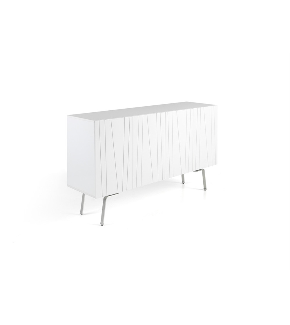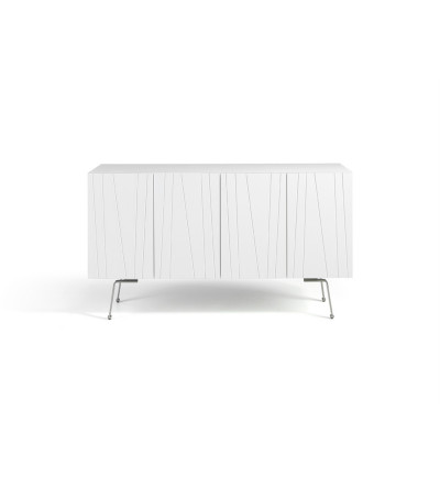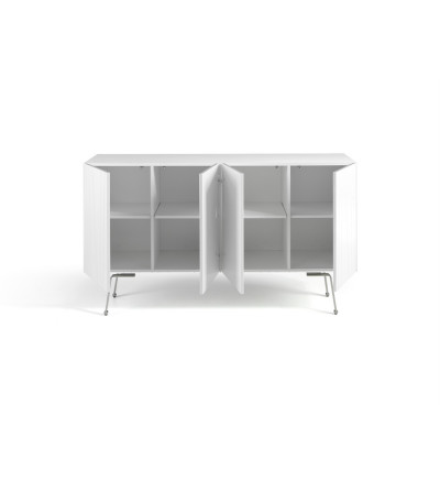 Aparador de cuatro puertas abatibles, acabado MDF lacado en blanco brillo bonito diseño con hendiduras en linea y patas de acero pulido.