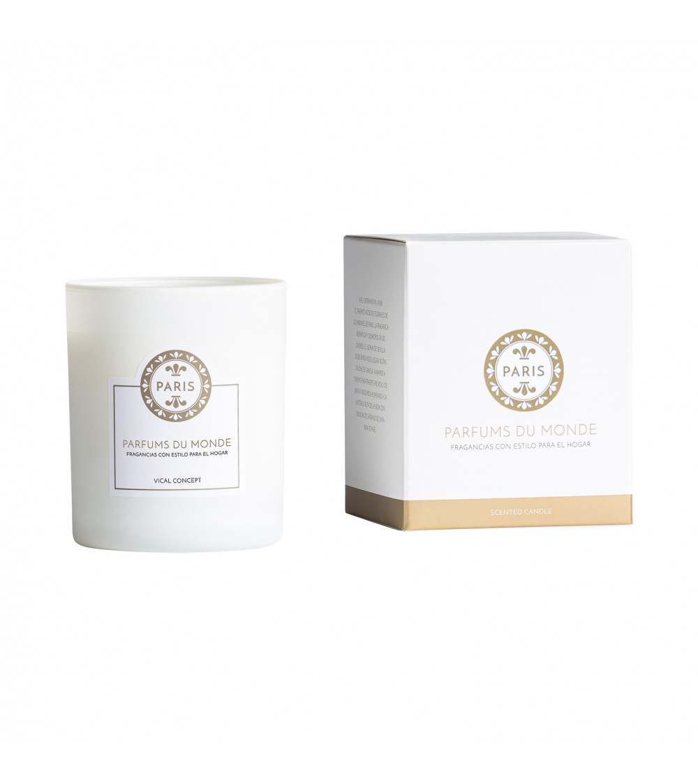 VELA GRANDE PARIS, EN COLOR BLANCO, DE ESTILO CLÁSICO. FABRICADO EN CERA, COMBINADO CON VIDRIO.