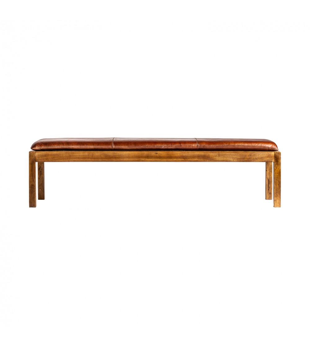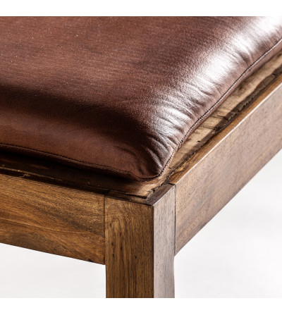 BANCO BISMARK, EN COLOR MARRÓN, DE ESTILO VINTAGE. FABRICADO EN MADERA DE MANGO, COMBINADO CON PIEL. PRODUCTO DESENFUNDABLE.