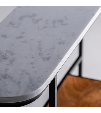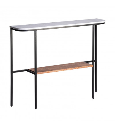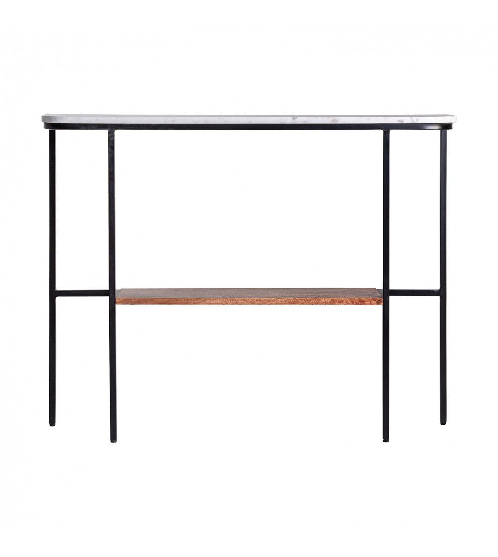 CONSOLA CUERA, EN COLOR NEGRO/ORO, DE ESTILO COLONIAL. FABRICADO EN MADERA DE MANGO, COMBINADO CON MÁRMOL Y ACERO.