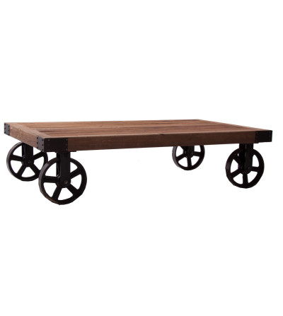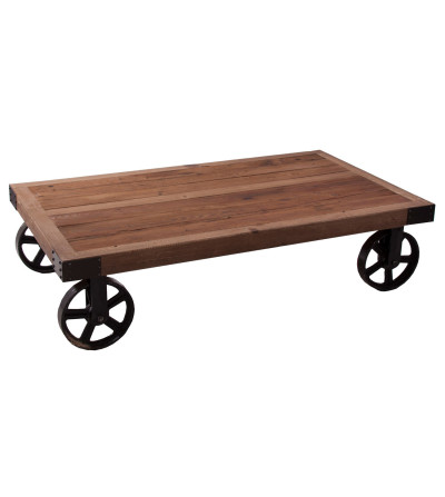 MESA DE CENTRO RECTANGULAR BERN, EN COLOR NATURAL, DE ESTILO INDUSTRIAL. FABRICADO EN MADERA DE OLMO RECICLADO, COMBINADO CON HIERRO. RUEDAS DE METAL. PRODUCTO DESMONTABLE.