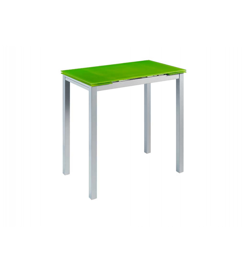 Mesa de cocina extensible con dos alas laterales con estructura y patas en metal con acabado nÃquel mate y encimera de cristal en color verde de 8 mm.