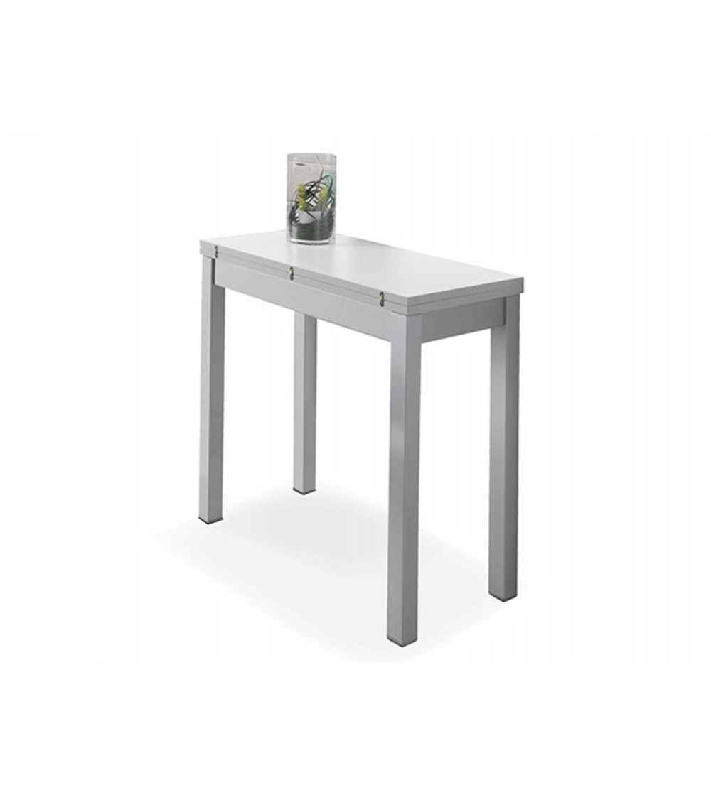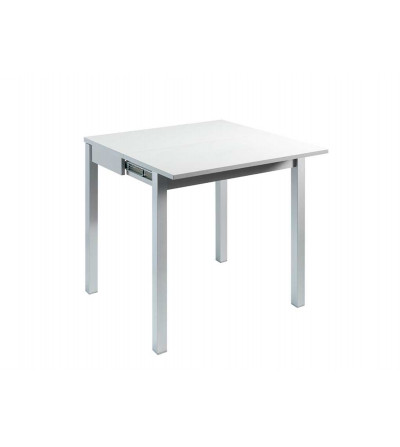 Mesa de cocina extensible con sobre tipo libro de madera laminada color blanco. Armazón de madera MDF con guÃa telescópica y patas metálicas con ruedas ocultas, ambas partes en color gris plata.
