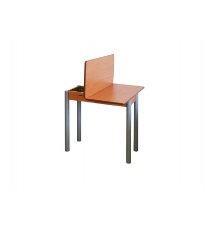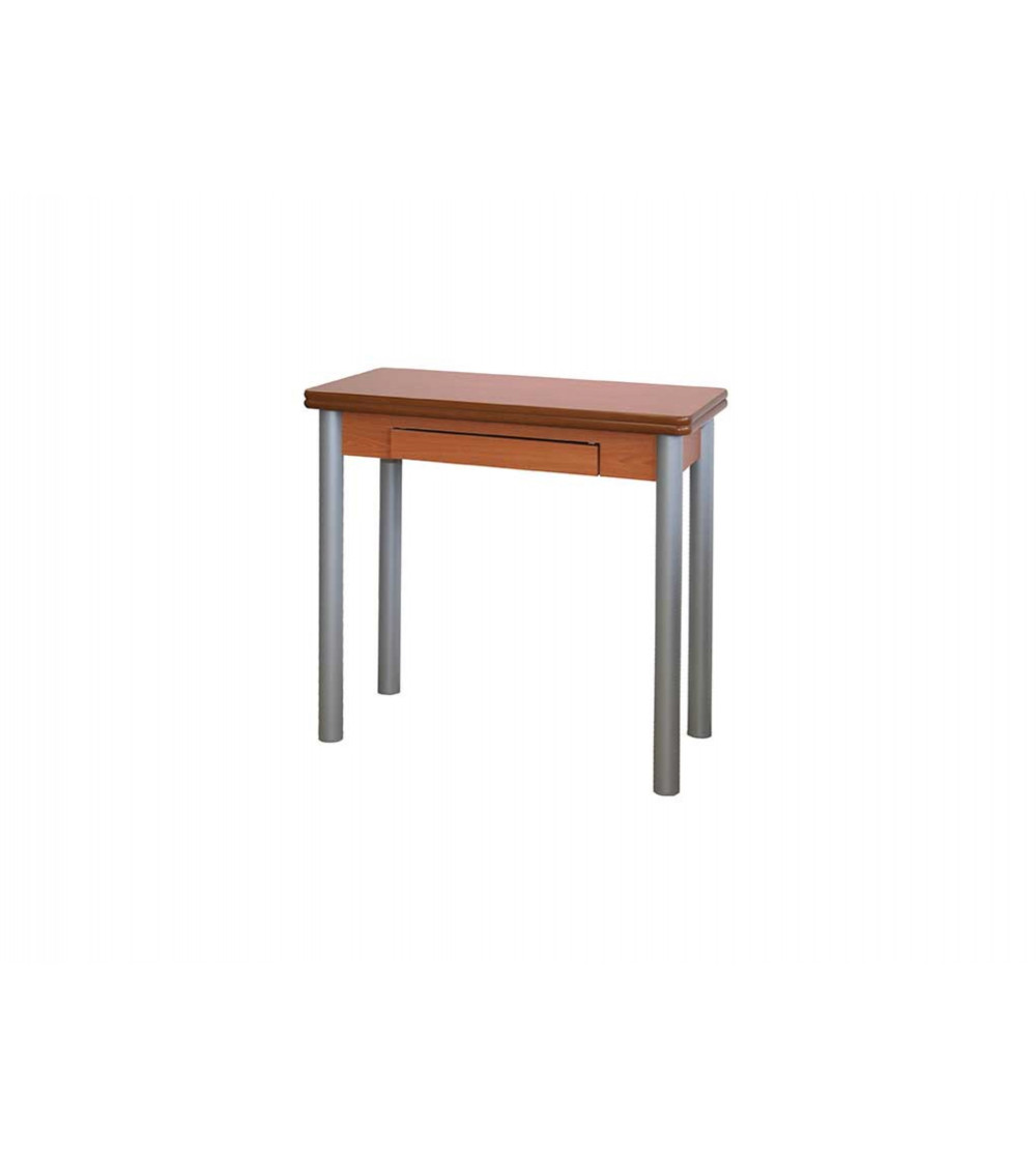 Mesa de cocina con encimera de apertura tipo libro. Estructura y encimera en MDF laminado cerezo. Acabado en canto redondeado. Patas cilÃndricas en metal de 5 cm de diámetro.