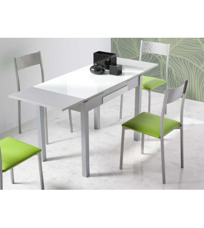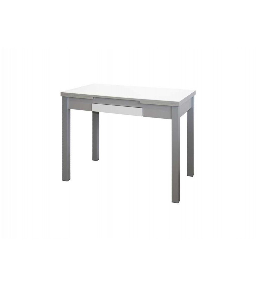 Mesa extensible con 2 alas en los extremos en madera laminada en gris plata. Tapa principal cubierta de cristal blanco. Estructura realizada en madera MDF. Patas metálicas. Incluye cajón. Frente del cajón a juego del color de la tapa.