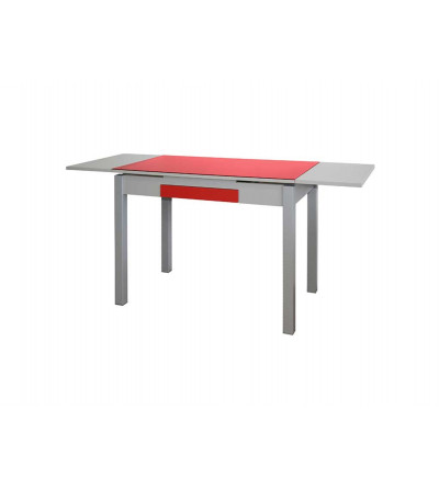 Mesa extensible con 2 alas en los extremos en madera laminada en gris plata. Tapa principal cubierta de cristal rojo. Estructura realizada en madera MDF. Patas metálicas. Incluye cajón. Frente del cajón a juego del color de la tapa.