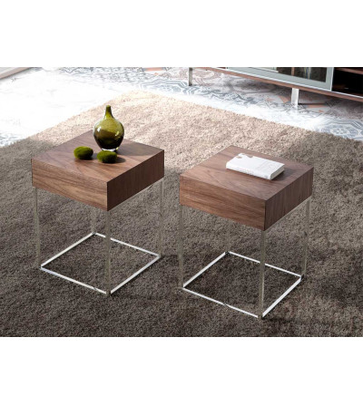 Mesita auxiliar con sobre y cajón integrado de madera MDF chapada en nogal. Estructura metálica bañada en doble cromo.