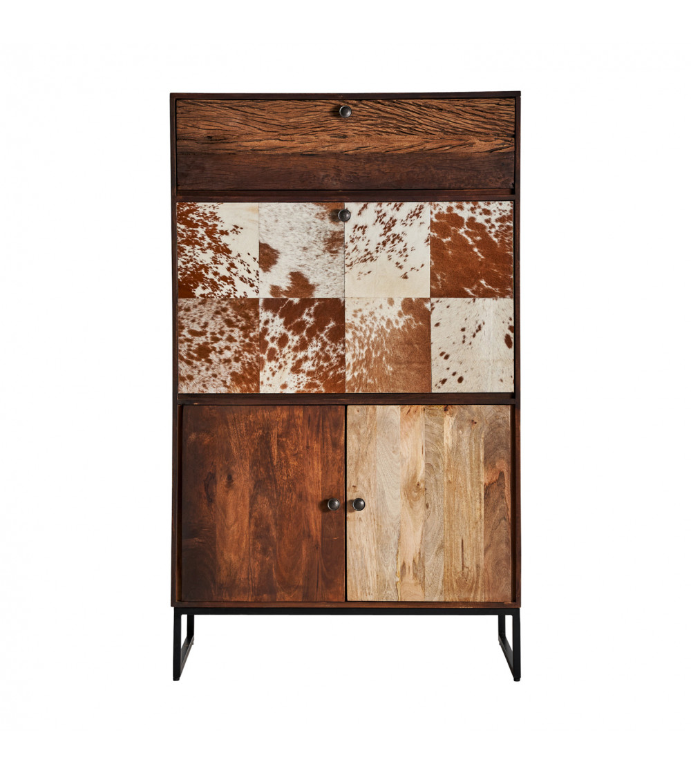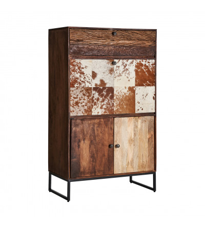 MUEBLE BAR TEXAS, EN COLOR MARRÓN/BEIGE, DE ESTILO NÓRDICO. FABRICADO EN MADERA DE MANGO, COMBINADO CON FORJA Y PIEL DE VACA. RECICLADO.