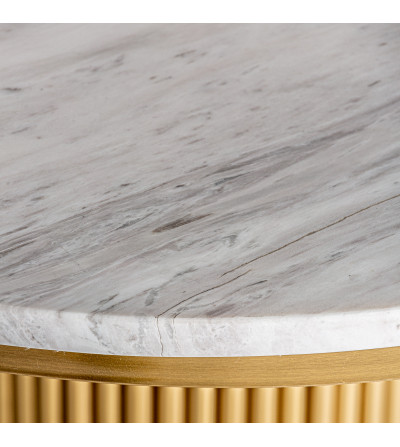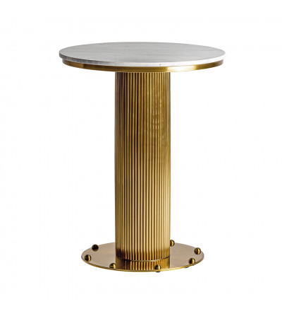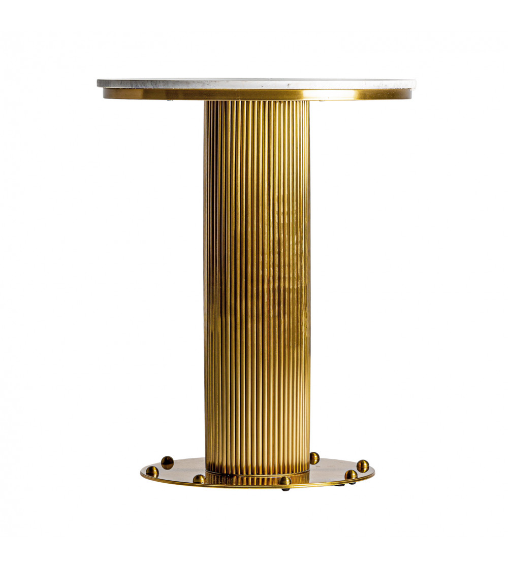 MESA BAR REDONDA DOLNY, EN COLOR BLANCO/ORO, DE ESTILO ART DECO. FABRICADO EN MÁRMOL, COMBINADO CON ACERO.