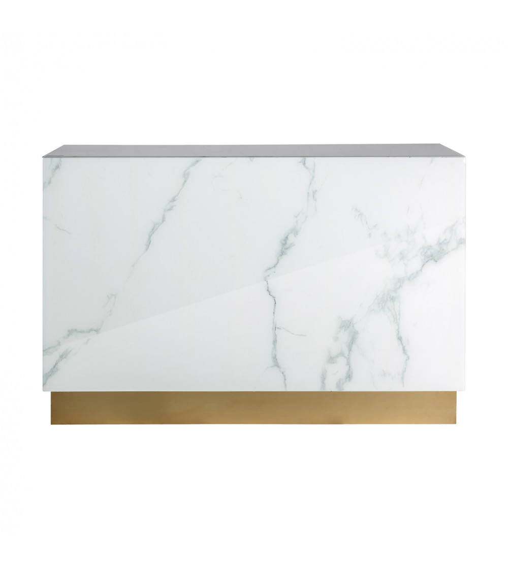 MOSTRADOR NEVA, EN COLOR BLANCO/ORO, DE ESTILO ART DECO. FABRICADO EN VIDRIO, COMBINADO CON ACERO.
