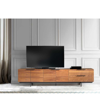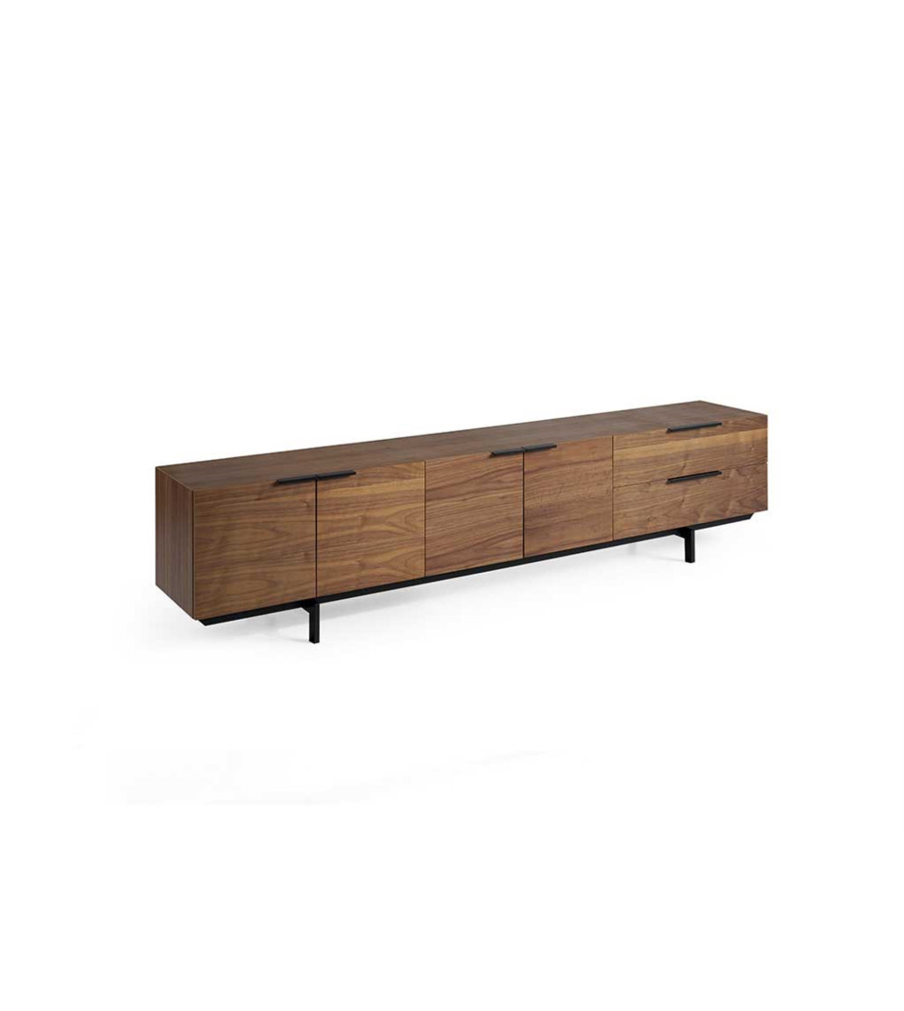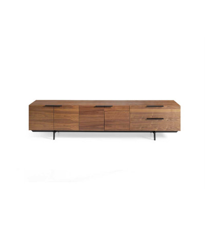 Módulo TV de cuatro puertas y dos cajones acabado en MDF chapado en nogal. Estructura y tiradores metálicos pintados en negro mate.