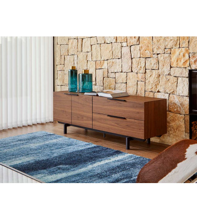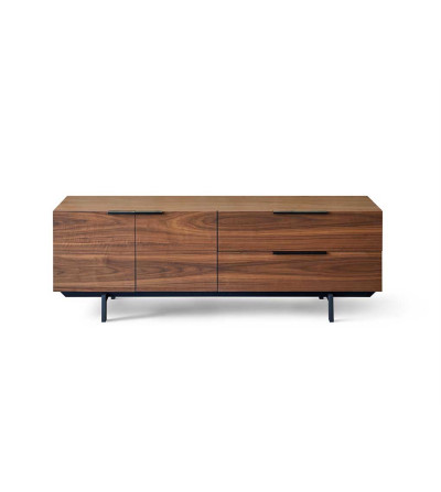 Módulo TV de cuatro puertas y dos cajones acabado en MDF chapado en nogal. Estructura y tiradores metálicos pintados en negro mate.