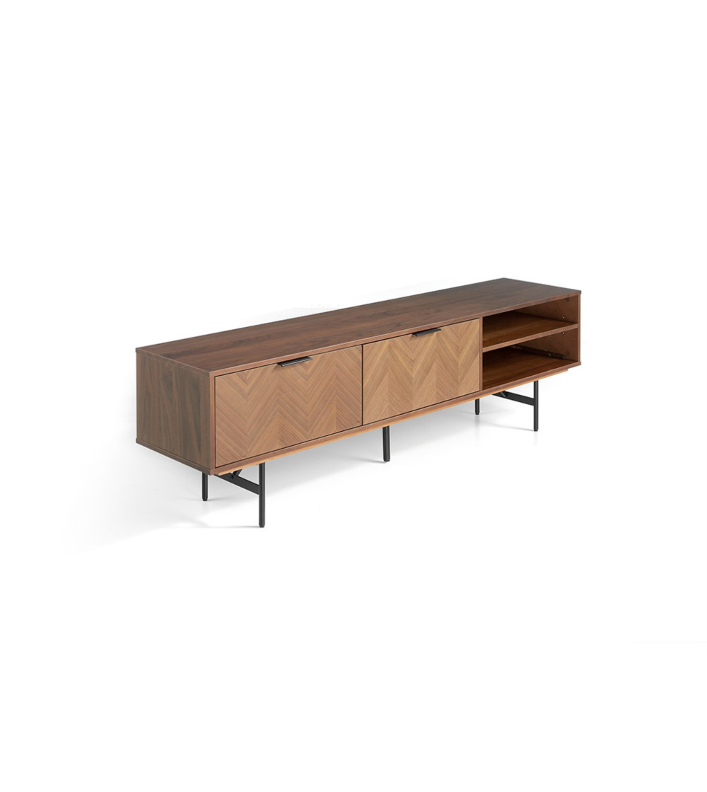 Mueble de TV de dos puertas abatibles con titadores de metal planos en negro mate y dos compartimentos con estante, acabado de chapa de madera de Nogal tipo Espiga y patas de metal negro mate.